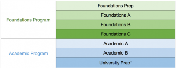 입학생은 영어 실력 수준을 결정하기 위해 시험을 치르며 배치 테스트의 성적에 따라 적절한 프로그램 수준에 배치됩니다.