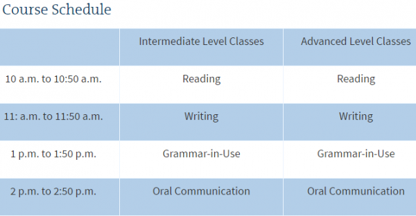 캠퍼스 도착 후, 학생들은 듣기 / 읽기 / 문법, 말하기 및 쓰기의 수준을 결정하기 위해 배치 시험을 치르며 구두 의사 소통 (말하기 및 듣기), 읽기, 쓰기 및 문법의 네 가지 기술 수업에 배치됩니다 .