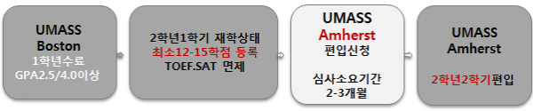 • SAT, TOEFL 상관없이 고등학교 내신 5-6등급 이상 입학보장 프로그램 . • 1학년동안(12개월) UMASS 측의 특별 관리수업 진행